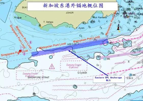 1)新加坡东港界外锚地(Eastern OPL Anchorage)是从柔佛港(Johor)进口航道以东由柔佛港界和新加坡分航通道(TSS)边界围成的狭长地带。