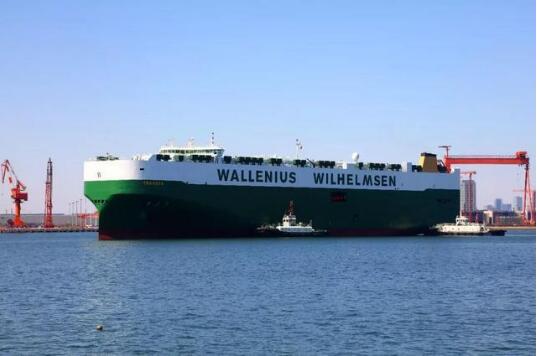 4月11日,中船重工新港船舶为瑞典华轮威尔森建造的高效、节能、环保型超巴拿马型8000车位汽车滚装船2号船顺利交船。