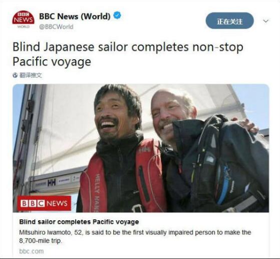 4月20日,日本盲人水手岩本光弘完成无靠岸式横渡太平洋,在不靠港的情况下航行了约1.4万公里,成为史上首位操作帆船渡过这片广阔海洋的盲人。