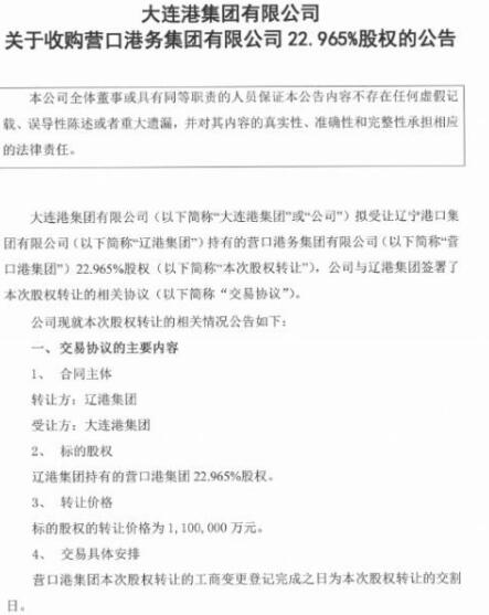 公告表示,辽宁港口集团有限公司(以下简称“辽港集团”)拟将其持有的营口港务集团有限公司(以下简称“营口港集团”)22.965%的股权转让给大连港集团,标的股权的转让价格为110亿元,双方就此次股权受让签署了相关协议。