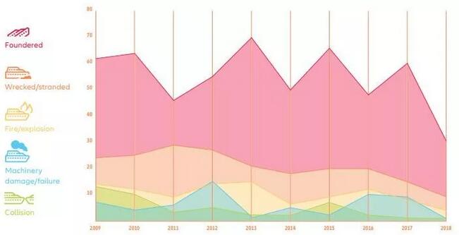 年度研究分析报告显示航运损失超过100总吨(GT)的事故,2018年为46起,低于2017年的98起损失,这主要得益于东南亚等事故热点数量的大幅减少。由于飓风和台风季节在今年较为平缓,由于天气造成的损失减少了一半。