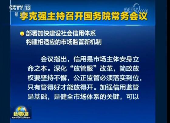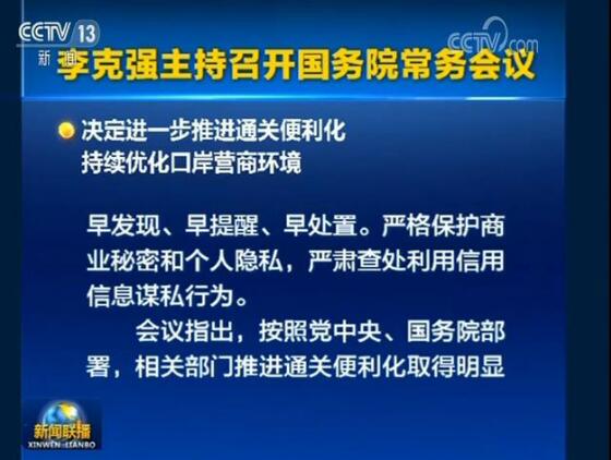 国务院总理李克强近日主持召开国务院常务会议,部署加快建设社会信用体系构建相适应的市场监管新机制;决定进一步推进通关便利化,持续优化口岸营商环境;要求更大力度对外开放,促进进出口多元化发展。