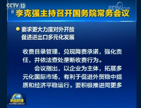 根据当时会议要求,进出口整体通关时间、进出口监管证件要再压减1/3并降低通关费用;消减进出口环节审批;开通农副产品快速通关“绿色通道”;清理规范涉企收费,年底前公示口岸政府性收费目录清单,清单外一律不得收费。