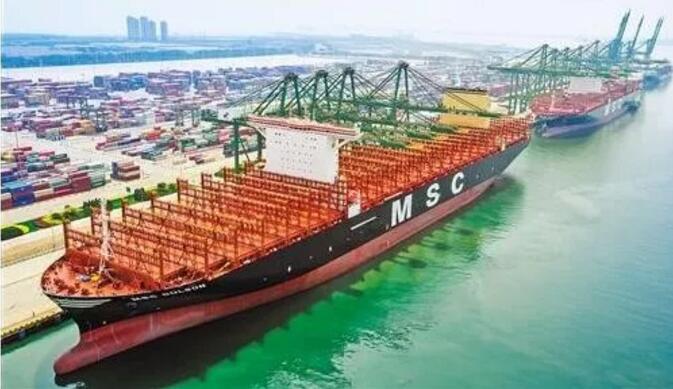 世界载箱量最大的集装箱船舶“地中海古尔松”轮在天津港首航。
