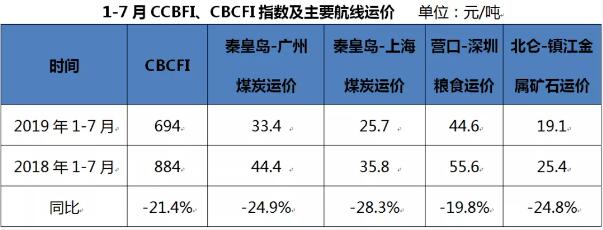 年初以来,受多重利空因素冲击沿海干散货市场表现不及预期,在诸如中美贸易摩擦升级、国内宏观经济下行压力加大、上年二手运力进口冲击显现等因素影响下,市场总体呈现低位震荡徘徊的走势。1-7月份,沿海煤炭运价指数CBCFI均值694点,同比下跌了21.4%,沿海主要航线运价同比上年同期亦大幅下跌。