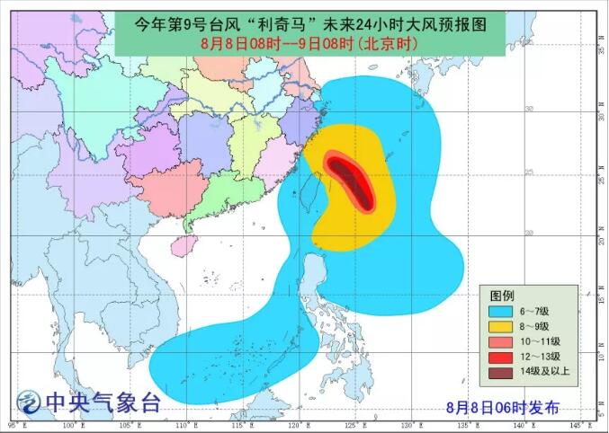大风预报:8日08时至9日08时,江苏南部沿海、长江口区、浙江沿海、福建中北部沿海、台湾岛沿海、台湾海峡、台湾以东洋面、东海大部、钓鱼岛附近海域、南海南部和中部偏东海域、巴士海峡的风力将逐渐加大到6-8级,其中台湾岛北部沿海、台湾以东洋面、东海南部的部分海域的风力有9-12级大风,“利奇马”中心经过的附近海域的风力可达13-16级,阵风16-17级。