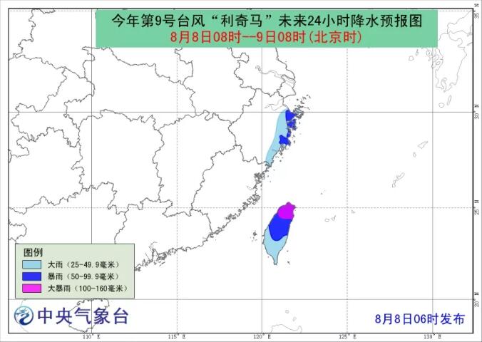 降水预报:8日08时至9日08时,浙江东部、台湾岛等地的部分地区有大雨或暴雨,其中台湾岛北部局地有大暴雨(100~160毫米)。