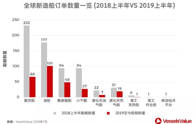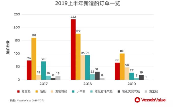 与2018年同期相比,2019年上半年的散货船新造船订单数量下降了73%。