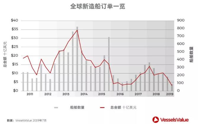 注定不平凡的2019年已过半,VesselsValue对上半年的全球新造船市场进行盘点,总体来说全球新造船市场普遍下滑。