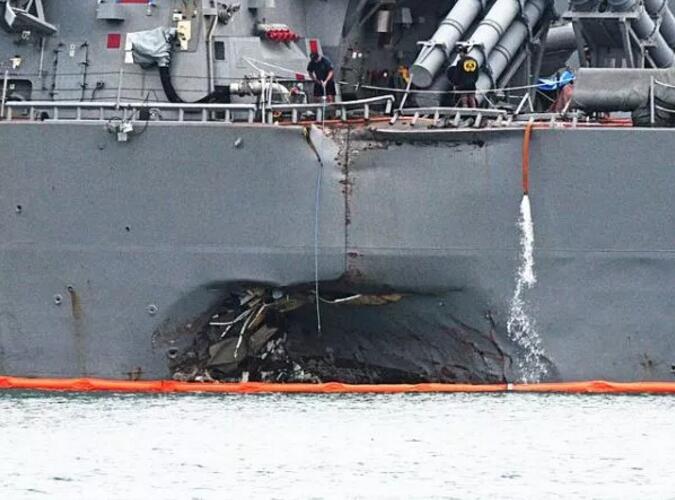 2017年8月21日早上,美国“约翰・麦凯恩”号导弹驱逐舰和“阿尔尼克”号商用油轮在新加坡海岸外并行行驶。“约翰・麦凯恩”号突然转向“阿尔尼克”号前方,造成两船相撞。事故导致“约翰・麦凯恩”号上10人死亡、48人受伤,遭受损失超过1亿美元。“阿尔尼克”号油轮没有人员伤亡报告,但它也蒙受了22.5万美元的损失。