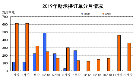 1~7月份,全国造船完工2211万载重吨,同比增长1.4%。承接新船订单1470万载重吨,同比下降38.9%。7月底,手持船舶订单8190万载重吨,同比下降8.4%,比2018年底下降8.3%。