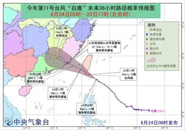 预计,“白鹿”将以每小时25-30公里的速度向西偏北方向移动,强度维持或略有增强,即将于24日中午前后登陆或擦过台湾岛东南部沿海(11-12级,30-33米/秒,强热带风暴级或台风级),之后移入台湾海峡,将于24日夜间到25日早晨在福建晋江到广东惠来一带沿海再次登陆(10-11级,25-30米/秒,强热带风暴级)。