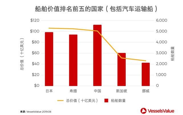 在汽车运输船的船舶价值纳入VesselsValue的估值系统后,最大的船东国的排名发生了明显变化。此前,希腊雄踞榜首,领先于中国和日本。然而,日本凭借庞大的汽车运输船队,所拥有的船舶资产总值目前已超越希腊和中国,跃居首位。