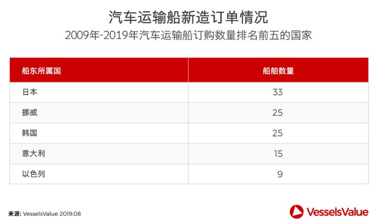 日本船东在汽车运输船市场仍名列前茅,在过去10年共订购了33艘汽车运输船。这并不令人惊讶,因为日本是全球第二大汽车出口国,仅在2018年交易量就达到990亿美元(约占全球总量的13%)。