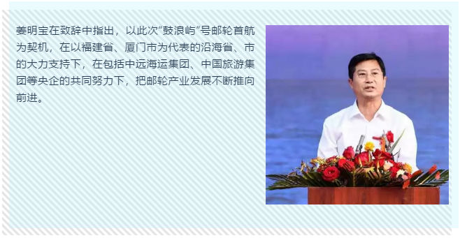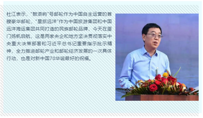“鼓浪屿”号承载着中国旅游集团和中远海运集团两大央企发展民族邮轮产业的使命,在世界邮轮领域发出中国强音,积极打造民族邮轮品牌,为新中国成立70周年献礼。
