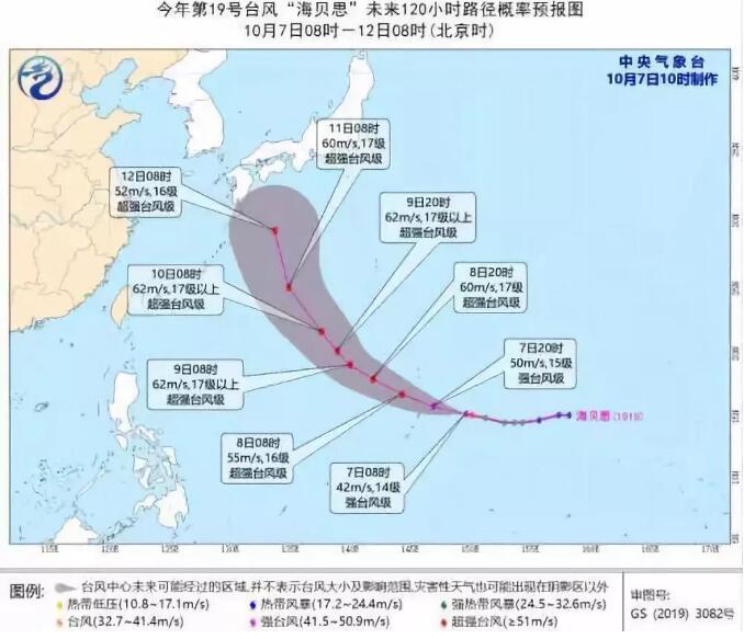 今年第19号台风“海贝思”未来120小时路径概率预报图
