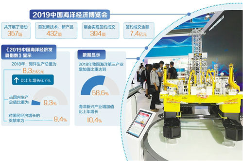 被称为“中国海洋第一展”的海博会,不仅是推进海洋新技术成果转化和产业化的重要功能平台,也是促进海洋经济国际合作的高端经贸平台。据悉,今年共计21个国家455家企业和机构参展。海博会上发布的《2019中国海洋经济发展指数》显示,2018年海洋生产总值为8.3万亿元,比2011年名义增长83.0%。对国民经济的贡献保持稳定,2011年至2018年海洋生产总值占国内生产总值比重保持在9%以上,2018年海洋经济对国民经济增长的贡献率达到9.4%,海洋经济规模再上新台阶。