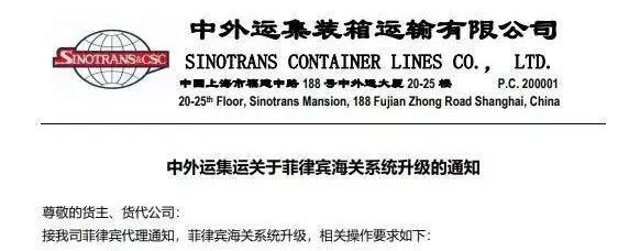 出货菲律宾的货主和货代注意了!近期,菲律宾海关升级系统,对进口货物HS CODE编码,提单号、地区代码(NATURE CODE 23/24)均作出新的要求和规定,未按要求提供数据将影响货物清关并产生罚金,责任和费用自行承担。中外运已发布通知!