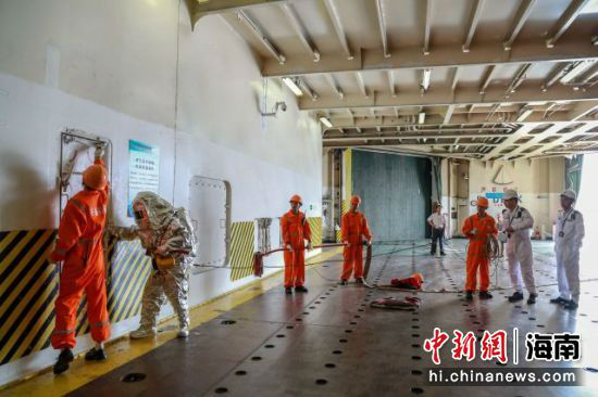 图为海事执法人员检验船员消防演习能力。海口海事局 供图