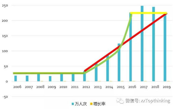 如果按照2012-2015年之间大致是一条直线,以这条直线进行外推,可以看到2016年多增长了约80万人次,2017年也大致多增长了80万人次,而2018年多增长了约45万人次。由此可以看到,2019年的规模大约在220万人次。一个猜想(仅仅是一个猜想,因为历史不可能重来),如果实际的游客增长按照这样一条渐进的直线往前走,会不会是一个更为理想的结果?与邮轮相关的配套体系都不需要承担过度增长的多余压力,行业是不是会显得更为健康?