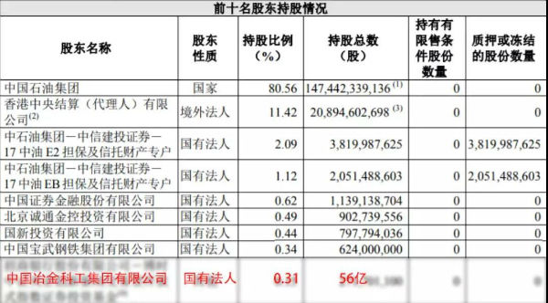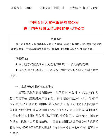 11月25日,中国石油发布公告,为加强中国石油集团与中冶集团战略合作,拓宽合作领域,优化公司股权结构,控股股东中国石油集团拟通过无偿划转方式将持有的中国石油股份公司5.6亿股A股股份(占公司总股本的0.31%)划转给中冶集团。5.6亿股对应32亿的市值。