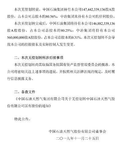2018年6月7日,中国石油集团拟将其持有的中国石油股份公司9.7亿股A股股份(约占公司总股本的0.53%)无偿划转给北京诚通金控投资有限公司,9.7亿股A股股份(约占公司总股本的0.53%)无偿划转给国新投资有限公司。