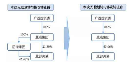 12月4日晚间,北部湾港(000582)发布公告表示,控股股东防城港务集团拟将所持公司47.42%股份无偿划转给广西北部湾国际港务集团有限公司(以下简称“北港集团”)。无偿划转及此前披露的协议转让完成后,防城港集团将不再持有公司股份,北港集团成为公司控股股东,直接持有公司63.06%股份,公司实控人仍为广西国资委。无偿划转与协议转让完成后,北港集团持有北部湾港股份变动情况如下: