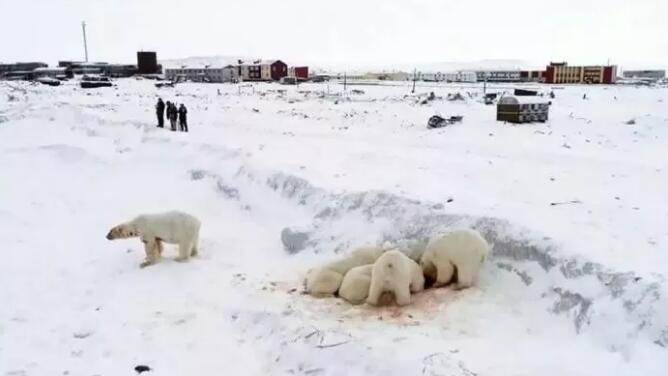 资料图:12月9日,全球气候暖化对生态影响加剧,俄罗斯北部楚科奇自治区雷尔凯皮村附近出现60多只北极熊。由于全球变暖导致海面冰层变薄,北极熊不得不闯入人类村落觅食。