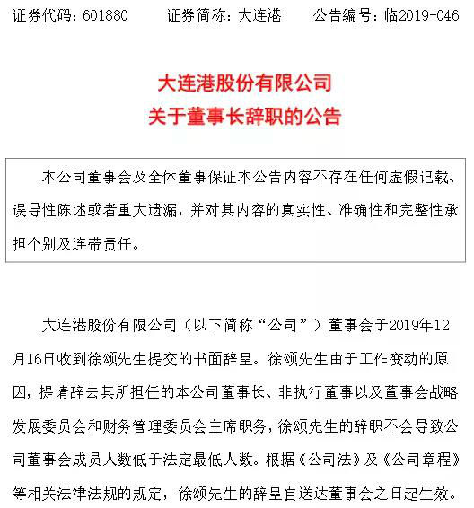 大连港股份有限公司董事会于2019年12月16日收到徐颂先生提交的书面辞呈。由于工作变动的原因,提请辞去所担任的公司董事会董事长、非执行董事、公司战略发展委员会及公司财务管理委员会主席,自2019年12月16日起生效。