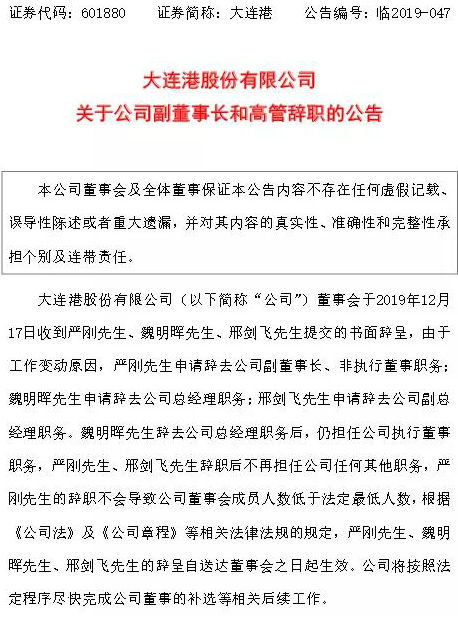 大连港股份有限公司董事会于2019年12月17日收到严刚先生、魏明晖先生、邢剑飞先生提交的书面辞呈,由于工作变动原因,严刚辞任董事会副董事长及公司非执行董事;魏明晖辞任公司总经理;邢剑飞先生辞去公司副总经理职务。