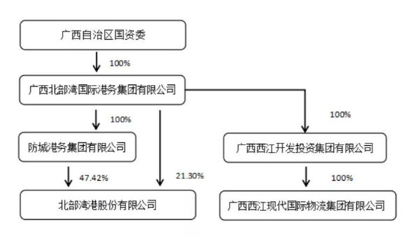 收购前,北部湾港持有贵港中转码头公司 78%股权,西江物流持有 22%股权;完成收购后,北部湾港将100%控股贵港中转码头公司。此外,北港集团持有广西西江开发投资集团有限公司 100%股权,广西西江开发投资集团有限公司持有西江物流 100%股权,北港集团直接及间接合计持有北部湾港68.72%股份。