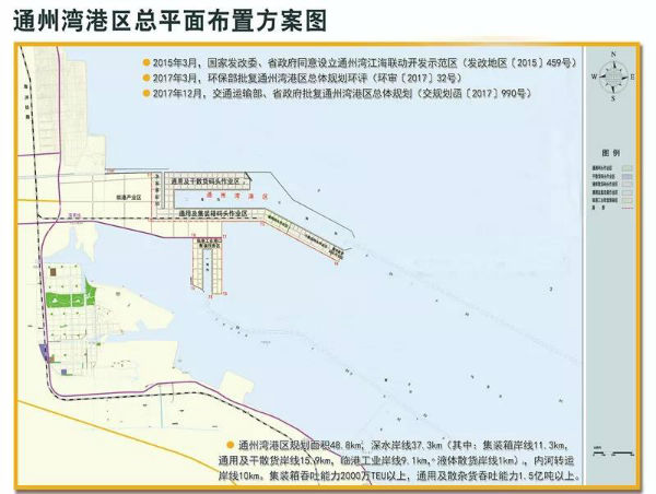 通州湾是江苏沿海难得的可建深水良港的港址,有望补上江苏省江强海弱、核心港口缺失的短板。根据交通运输部和省政府2017年年底的联合批复,通州湾港区规划深水岸线37.3公里,规划建设5万吨级码头泊位30个、10万吨级以上泊位86个。