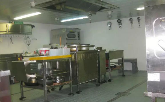 到厨房查看排烟罩,用手拭擦内楞有无油迹,判明排烟管系完好。查看配膳间,操作间是否整齐,灯光适度;询问食物饮用水是否为专用管路和水柜,是在何时何地加的,随手拧开水龙头,将水放进透明玻璃水杯肉眼观看是否纯净无絮状物。环视了炊具里的配膳,辨认是否保鲜。