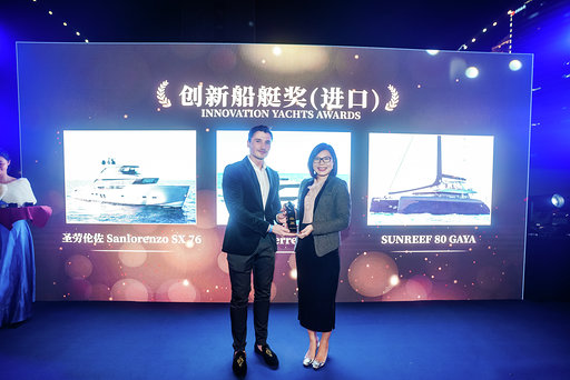 Sunreef 80 Gaya荣获海之蓝中国游艇奖,并被评选为业内最具创新的游艇之一,Sunreef Yachts游艇的代表于1月3日,星期五,中国深圳,在由《海之蓝》杂志举办的此次颁奖晚宴的舞台上,接受了该奖项。