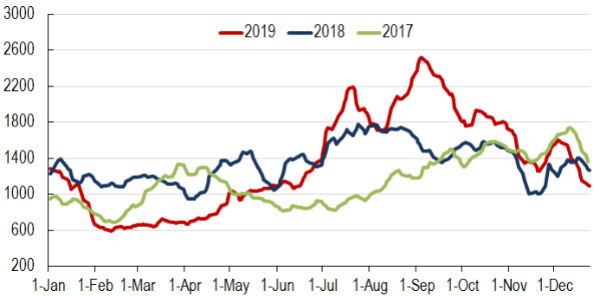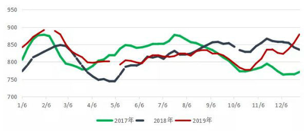2017-2019年BDI走势对比图