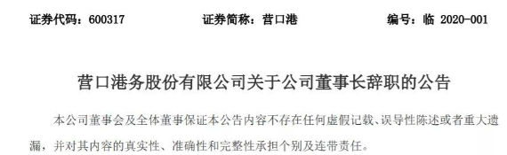 1月16日,营口港务股份有限公司(以下简称“营口港”)发布公告称,公司董事会于 2020 年 1 月 14 日收到董事长司政的书面辞职申请。司政因工作调整原因,申请辞去公司第六届董事会董事长、董事职务,同时不再担任公司法定代表人。司政辞职后将不在公司担任任何职务。