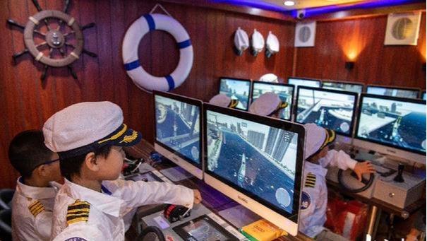 航海体验馆主题船集航海模拟驾驶体验、航海科普、模拟驾驶教学于一体,将珠江游船与航海模拟操作系统进行结合,融“观光、娱乐、科教”为一体,让游客能在真实的乘船环境下,得到超高还原度的航海体验。