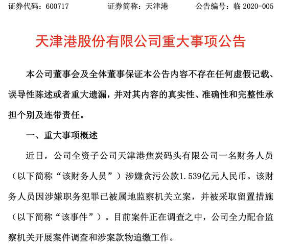 2月12日晚间,天津港公告称,近日,公司全资子公司天津港焦炭码头有限公司一名财务人员涉嫌贪污公款1.539亿元人民币。该财务人员因涉嫌职务犯罪已被属地监察机关立案,并被采取留置措施。目前案件正在调查之中,公司全力配合监察机关开展案件调查和涉案款物追缴工作。