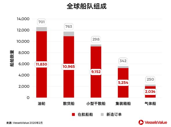 以下是全球商船船队组成图(油轮,散货船,小型干散船,集装箱船和天然气船),包括在航船舶和在建船舶。