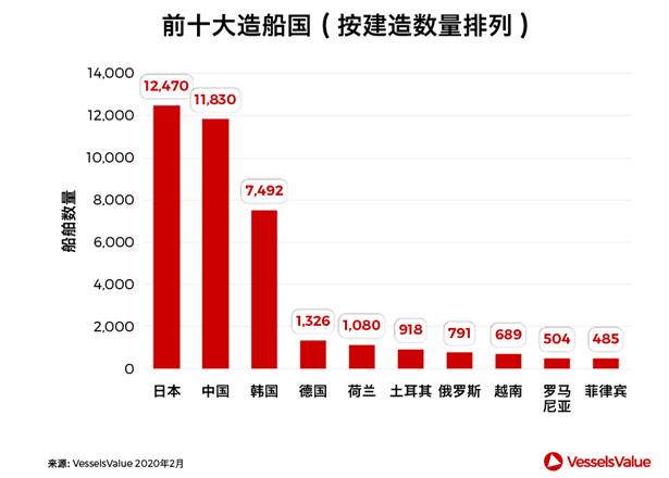 下图为前十大造船国(按建造数量排列),这些国家造船数量的综合占全球船队总数的90%以上。