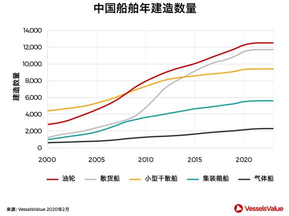 下图显示了中国船舶建造能力在过去二十年的增长情况(以数量计), 近十年内有显著增长。