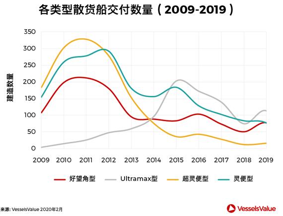 上图显示了过去10年间各类型散货船的交付情况。好望角及以上船型的交付数量在2011年达到了顶峰,为211艘;之后逐年下降,这种暴跌是2008年金融危机的后果。