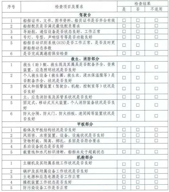 3.要加强船舶开航前自查。航运企业和船东要组织开展船舶开航前自查,特别是AIS、VHF、电子海图等通导设备、主辅机等动力设备和船体状况的检查,同时开展船舶名称、载重线和船籍港等船舶标识的勘画工作,加强船舶维护保养,确保船舶处于良好状态,不“带病航行”。