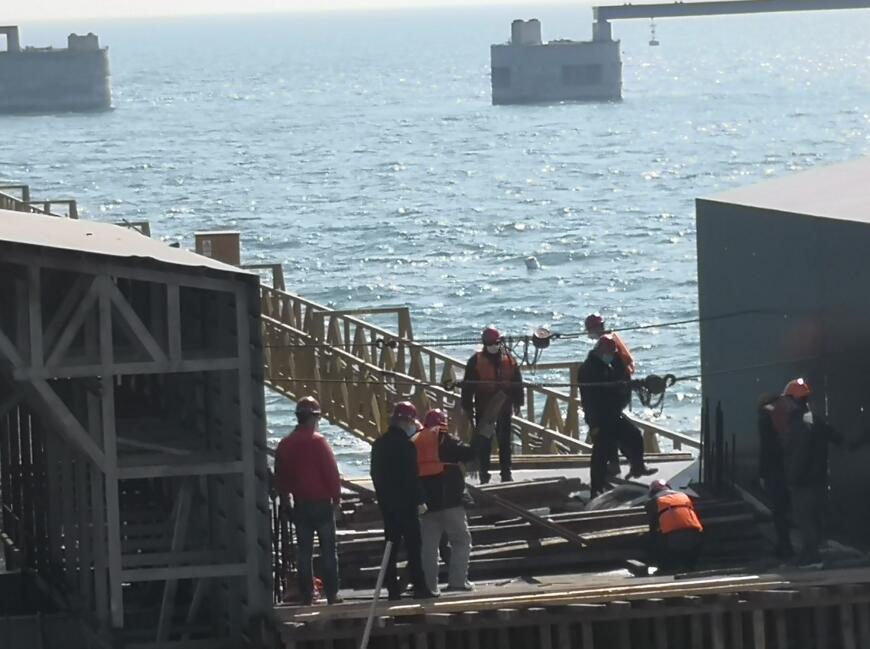 董家口港区原油码头二期工程2019年开工建设,前期受疫情影响停工。2月10日以来,山东港口青岛港认真贯彻落实习近平总书记重要指示精神,按照省委省政府的要求和山东省港口集团的部署,在全力抓好疫情防控的前提下,多次现场督导复工安排,组织施工和监理单位克服疫情形势下人员、设备、物资紧张等困难,把好人员筛选关、交通关、隔离关、监测关、动态跟踪关“五道关”,做到居住分离、开会分离、就餐分离、防疫物资分离“四个分离”,保证教育培训到位、防疫物资到位、防护穿戴到位、生活物资到位“四个到位”, 落实施工单位自查、监理监督检查、建设单位抽查“三级检查”,搞好复工前安全培训和防疫培训“两个培训”,制定了专项复工方案和疫情防控方案,第一时间向集团主管部门和青岛市行政主管部门报备。2月13日,参建单位管理人员进场;2月17日,市主管部门对施工单位工人隔离区进行了现场核查,具备工人进场条件;2月18日工人进场施工,项目主体施工加快推进。