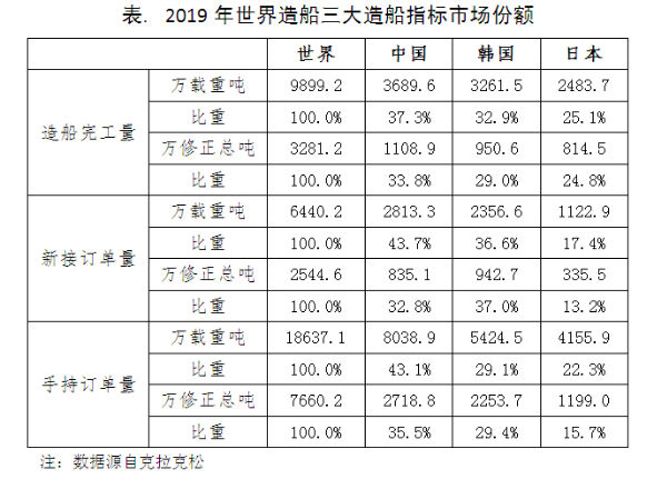 2019年,以载重吨计,中国三大指标均居世界第一,以修正总吨计,除新接订单量不及韩国外,中国造船完工量和手持订单量亦居首位,中日韩“三足鼎立”格局进一步向中韩“两强争霸”态势演变。然而,肺炎疫情的爆发给今年的竞争态势带来较大的不确定性。