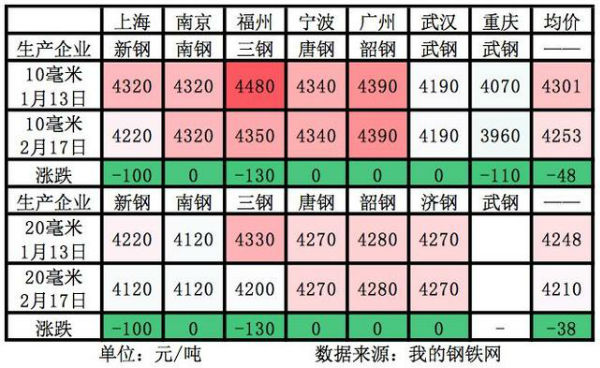 在这样的大环境下,船板价格也一改往年春节前后成交少但价格稳的走势。据我的钢铁网数据,1月13日~2月17日,全国主要船板市场价格弱势下行。具体来看,1月13日,10毫米船板均价为4253元/吨,比之前下跌了48元/吨;20毫米船板均价为4210元/吨,比之前下跌了38元/吨。