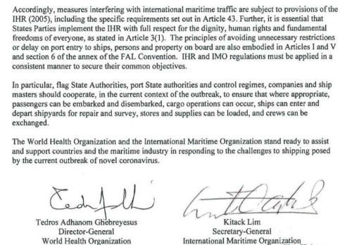 联合声明指出,虽然世界卫生组织(WHO)不建议任何旅行或贸易限制,但是全球各国正在采取措施,包括延迟通关或拒绝入境等,可能对国际海上交通造成严重影响,特别是船舶、船员、旅客和货物。