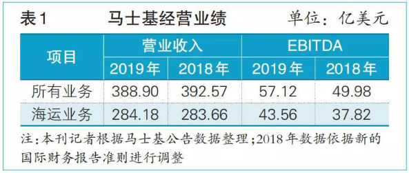 2019年,市场环境趋弱,全球集装箱货量增长仅为1.4%,但基于有效的成本控制,马士基的盈利表现有所提升。2月20日,马士基发布经营业绩报告,2019年营业收入为388.90亿美元,略低于2018年392.57亿美元;息税折旧及摊销前利润(EBITDA)为57.12亿美元,同比增长14.29%(见表1)。