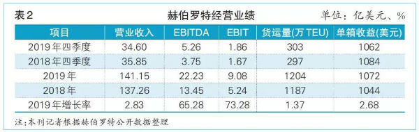 2019年,追寻服务提升、追求盈利能力和着力从班轮业本质从事经营的马士基和赫伯罗特的单箱收益均在上升,它们的盈利也报大幅增长。