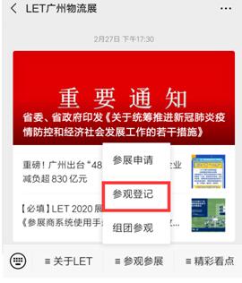关注“LET广州物流展”公众号,点击参观参展-参观登记